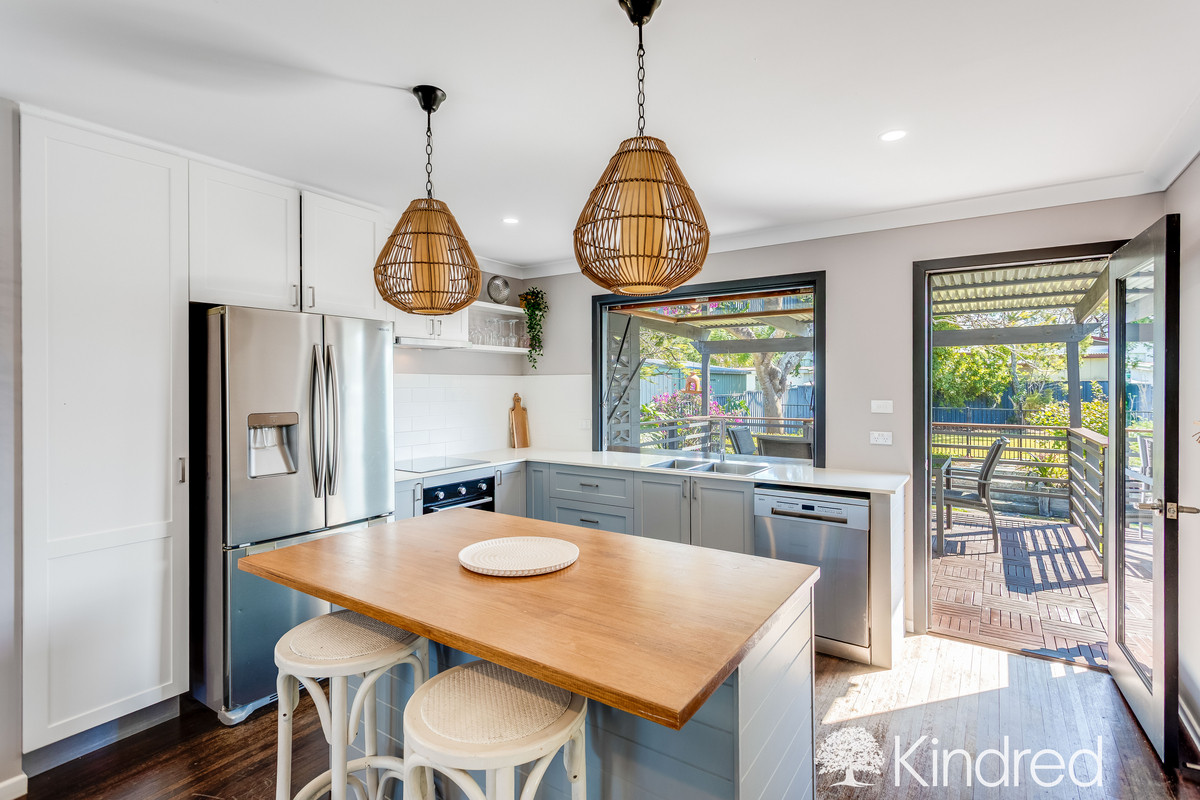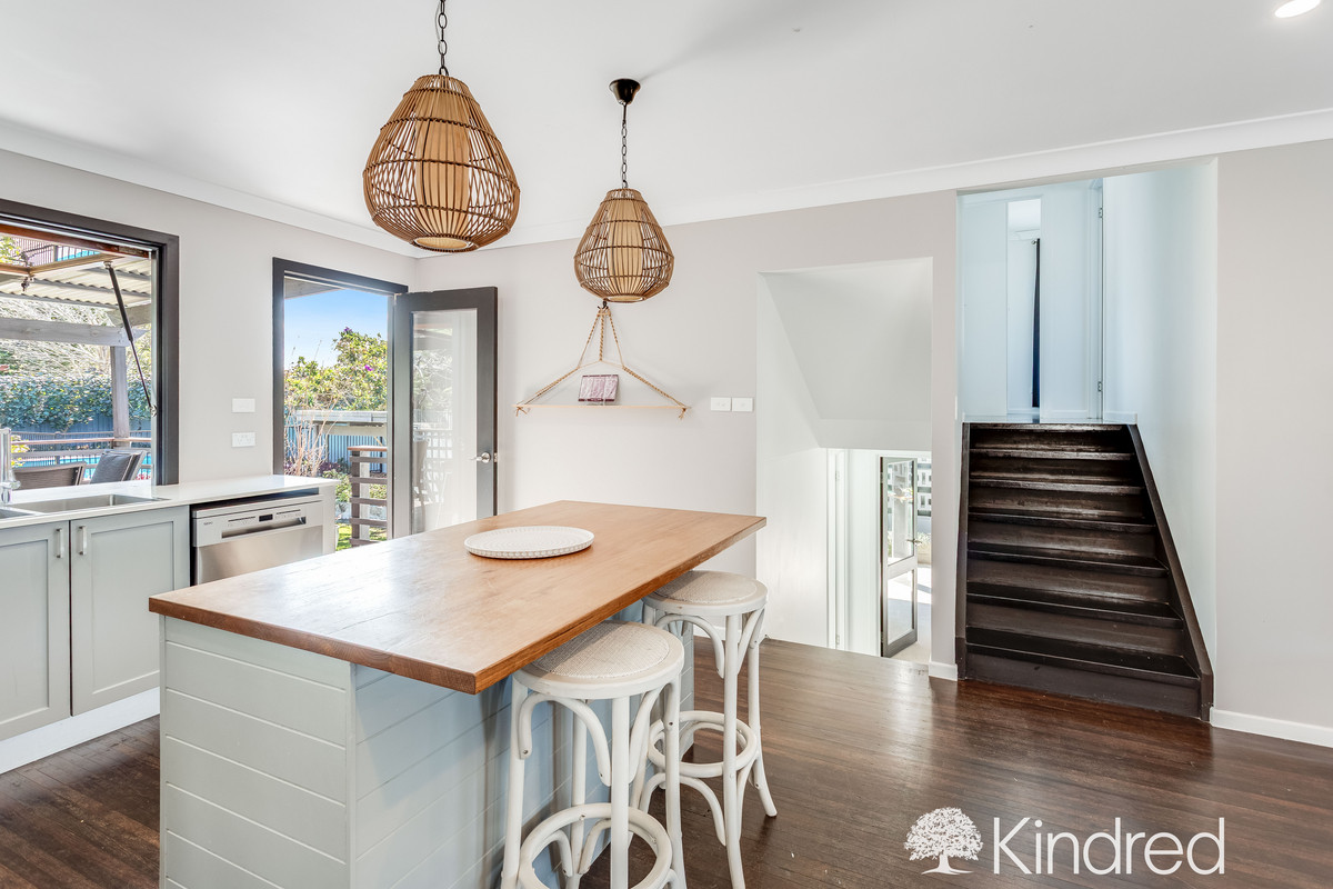 The gorgeous dark polished floorboards lead into the modern kitchen with stone bench, dishwasher and servery out to the deck for a glorious outdoor living option. Opening the servery window to access your guests opens all forms of entertaining. A fabulous renovation that offers Hamptons flare along with modern convenience. The kitchen is not only functional but also stylish, making meal preparation a joy rather than a chore.