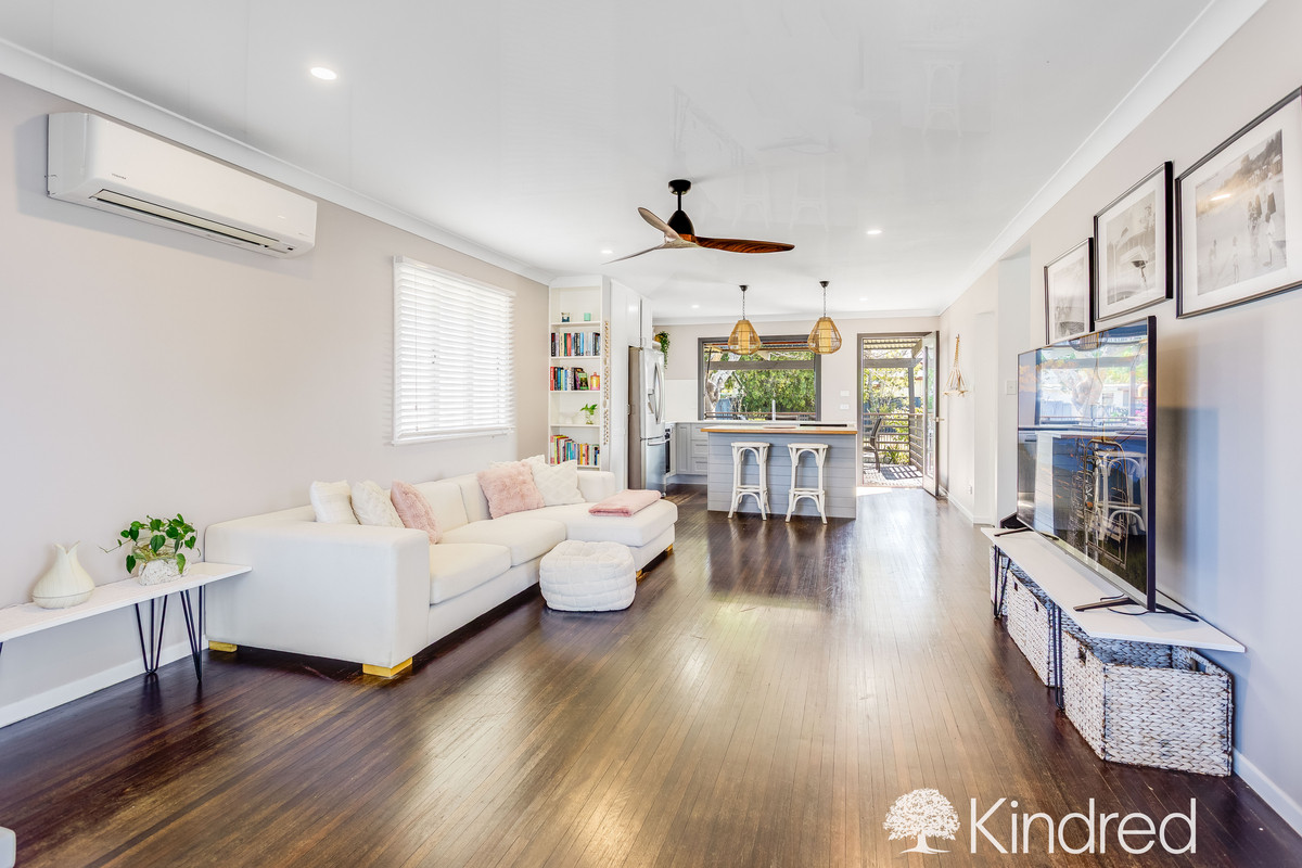 With three spacious bedrooms and two modern bathrooms, built-in robes, and ceiling fans throughout, this home offers an inviting atmosphere for families or couples looking to capture a large family home. The dark timber floors add to the generous contrast of light and ambience. Each room has been thoughtfully designed to maximize space and comfort, ensuring a restful retreat at the end of each day.