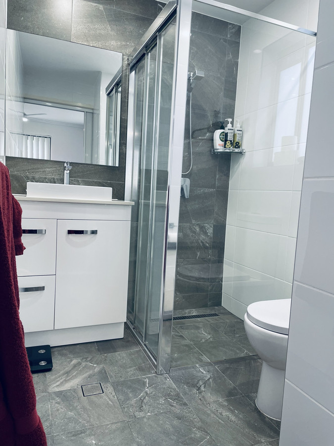 The modern bathroom is stylish and functional, featuring a well-appointed shower and contemporary finishes. A private external laundry adds to the home’s practicality, keeping heat and noise outside while offering excellent storage, a Simpson clothes dryer, and a convenient foldaway clothesline.