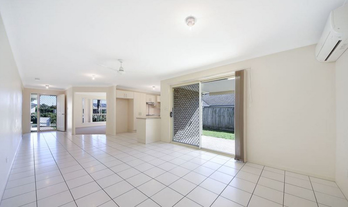 Featuring two large living areas, including a separate lounge and an open-plan kitchen/dining area with air conditioning and ceiling fans throughout. The modern kitchen includes a pantry, ample storage, electric cooking, and a dishwasher.